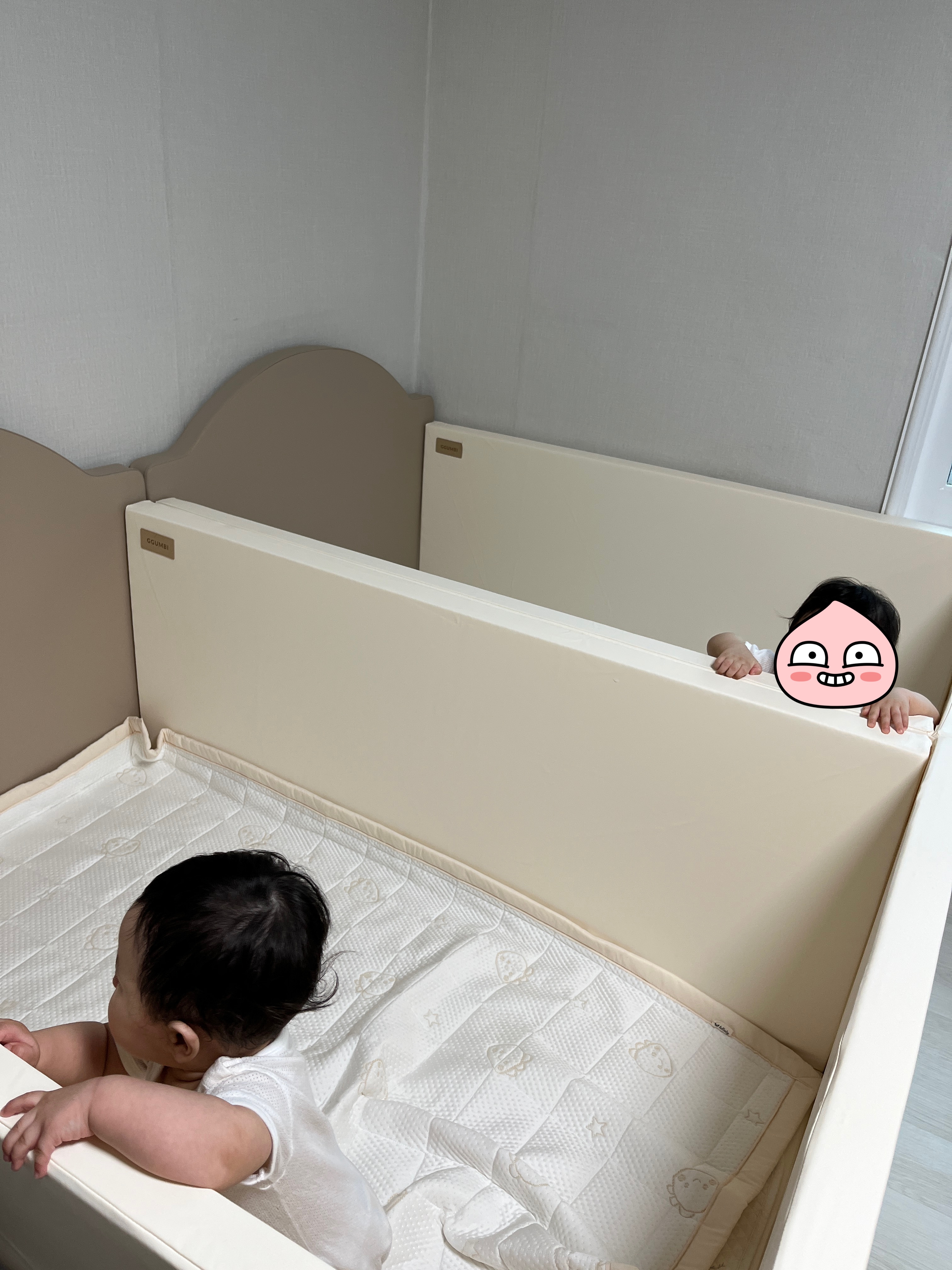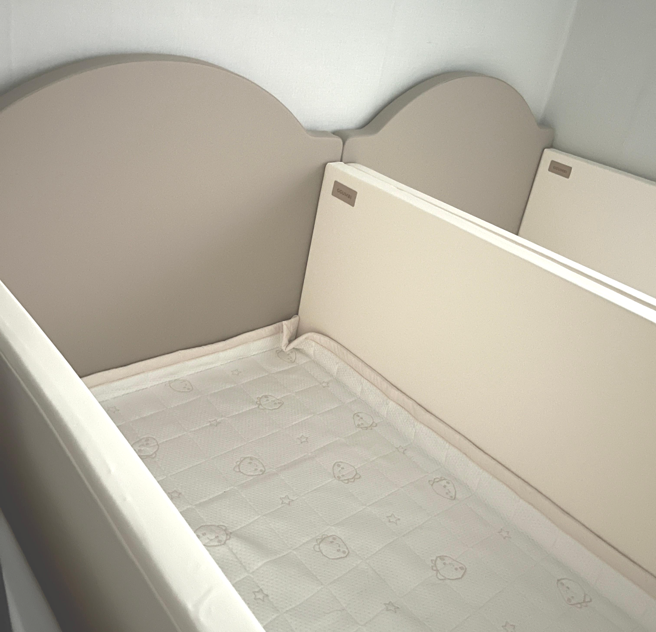 뒤집기·되집기·배밀이·기어다니기를 마스터하니, 30cm 쿠션가드는 무용지물. 자는 아이를 먼저 깬 아이가 깨우러 가거나, 쿠션가드 밖으로 탈출하는 일이 반복됐고 새벽마다 서로 깨워 부모 수면장애로 이어졌습니다.